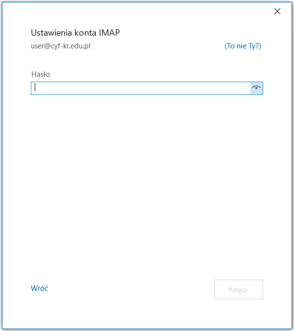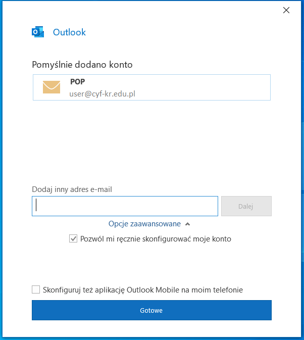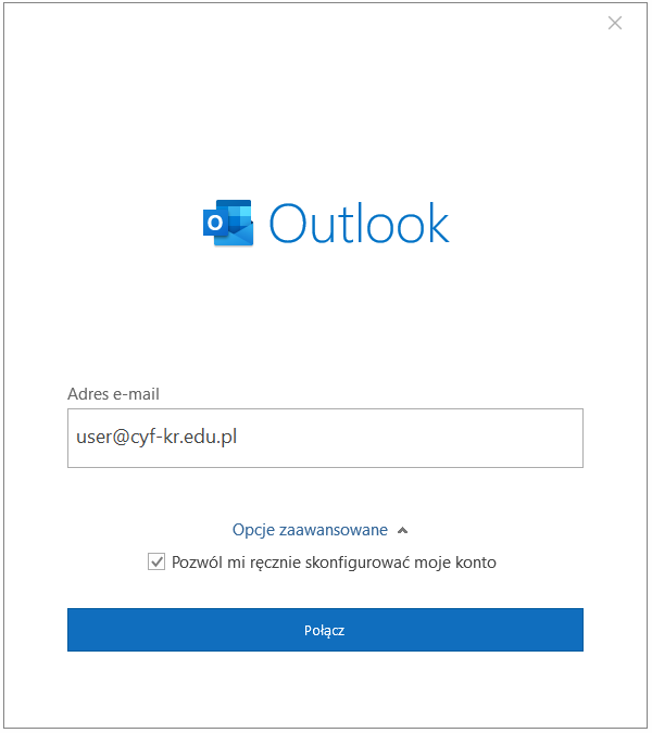 Wpisujemy tu adres e-mail z serwera kinga w postaci username@cyf-kr.edu.pl oraz w opcjach zaawansowanych