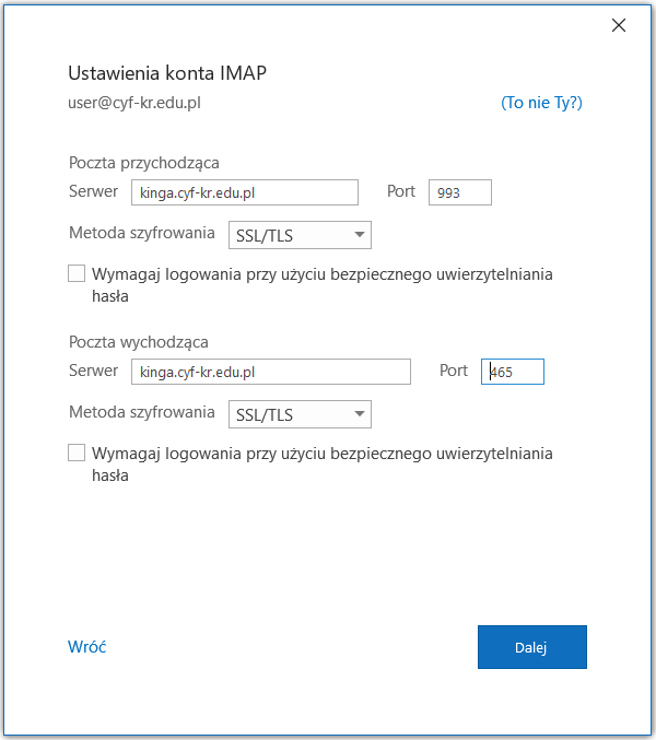 Serwer poczty wychodzącej to kinga.cyf-kr.edu.pl, port 465. Metoda szyfrowania SSL/TLS.