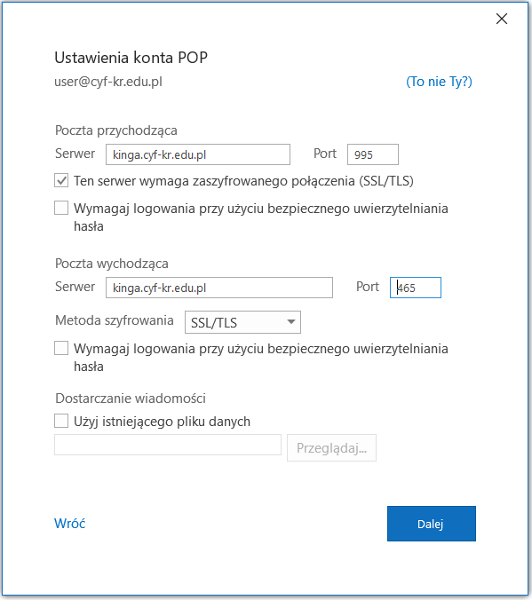 Serwer poczty przychodzącej to kinga.cyf-kr.edu.pl, port 995. Zaznaczamy opcję zaszyfrowanego połączenia (SSL/TLS).